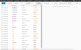 Entre as principais funcionalidades, destaca-se a visualização em linha do tempo, que apresenta eventos de pré-paint, modelo, transações e sistema em um layout organizado. O painel é redimensionável e permite uma interação suave, com persistência de LocalStorage. Os usuários podem aplicar filtros detalhados para agilizar a busca por eventos, além de acessar informações detalhadas sobre cada evento, incluindo visualização JSON colapsável e cópia de dados para a área de transferência. Com o FirstTx DevTools, a depuração de aplicativos se torna uma tarefa muito mais clara e acessível.